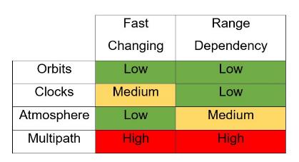 Luo’s colleague Bernhard Richter, vice president of geomatics, explained it. “To understand this, you need to separate the elements of corrections into those that are fast changing and range dependent (see the graphic below). If the errors change slowly, then they can be estimated and predicted very well. Or, if the range dependency is low, errors could come from a different source than the base station. If the range dependency is medium or high, then the corrections are more difficult to estimate on the rover side, but if such errors change very slowly, they can still be predicted very well with the precondition that corrections have been received at least once.”