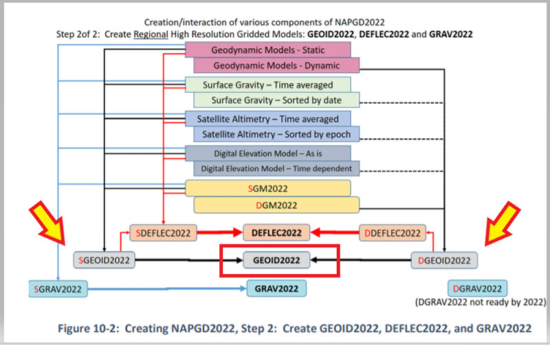 NGS will publish a GEOID2022 value that will be based on both SGEOID2022 and DGEOID2022. As stated in the document, GEOID2022 will be the official zero-height surface for orthometric heights within NAPGD2022, and thus within the NSRS. The box titled “Excerpt from Blueprint for 2022, Part 2, Figure 10-2” is a diagram that describes the process of creating the regional high resolution gridded GEOID2022 model. I have highlighted the GEOID2022 model and its two components, SGEOID2022 and DGEOID2022.