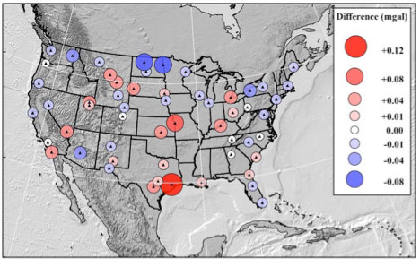 The box titled “Gravity Differences between NGSGN and IGSN71 Common Stations” depict these differences. The report states “In summary, the gravity differences between NGSGN and IGSN are generally small and many of the larger differences may be due to vertical motion.