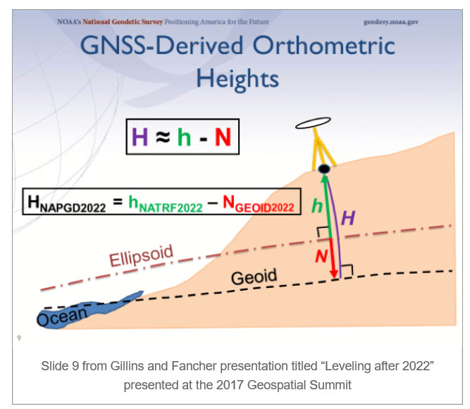 First, it’s important to note the role of the geoid in estimating GNSS-derived orthometric heights. As described in a previous column, GNSS-derived Orthometric Heights are computed using the following formula: orthometric height (H) = ellipsoid height (h) minus geoid height (N). See the box titled “NAPGD2022 GNSS-Derived Orthometric Height.”