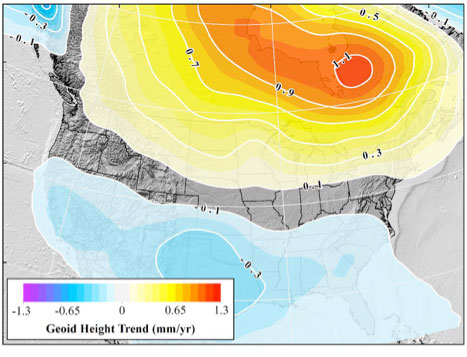 The report stated that when considering monitoring the geoid, the greatest change to the geoid from glacial isostatic adjustment (GIA) processes is centered in northern Canada, but there is “still a significant geoid height trend in the Northern Plains, Great Lakes, and Northeast regions of CONUS.”