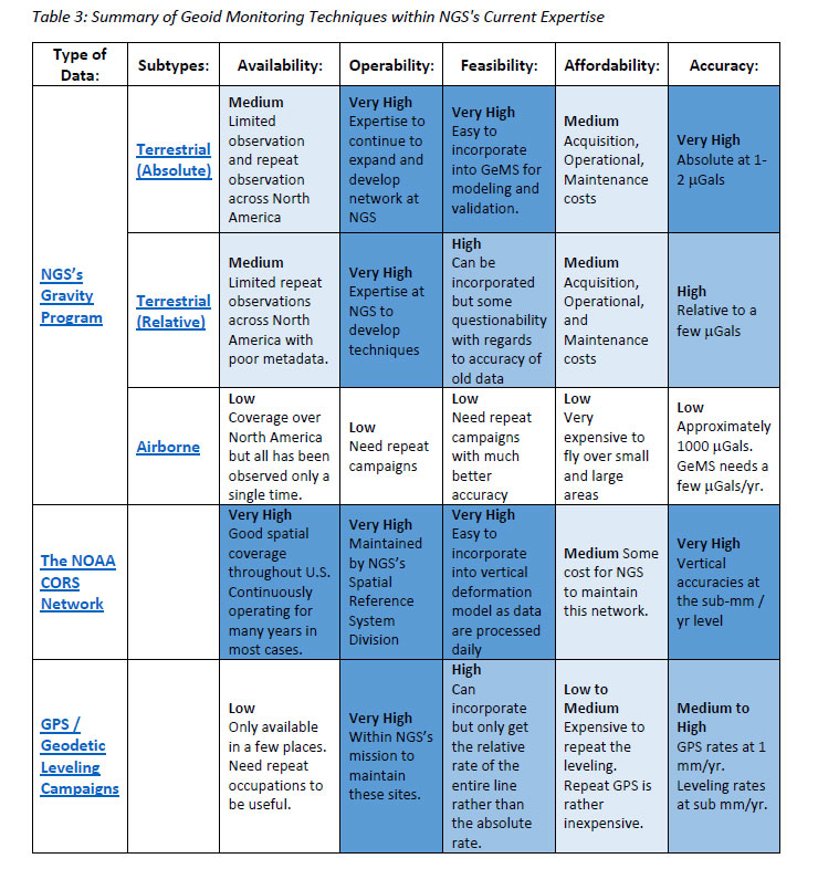 It is noted that individuals these techniques cannot provide 100% of what GeMS requires but combining various programs would be sufficient. The report does a great job of describing these three program areas. The box titled “Summary of Geoid Monitoring Techniques within NGS’ Current Expertise” is Table 3 from the Technical Report. The table list the affordability and accuracy attributes for each of the program areas. NGS’ Gravity Program provides high quality gravity data to internal and external stakeholders. The program provides gravity data required for NGS’s geoid modeling.