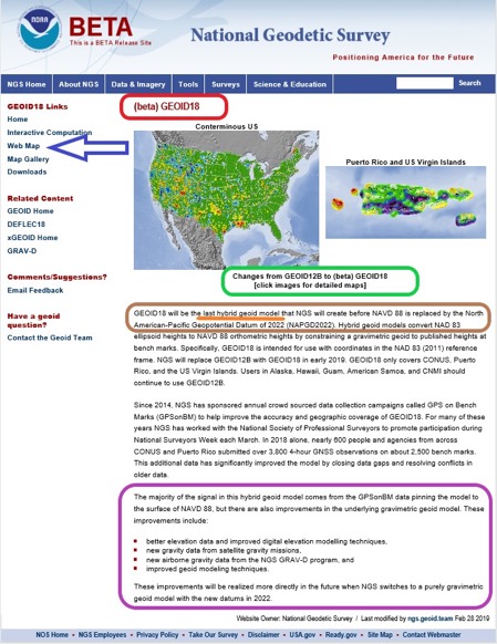 My last column included links to the NGS website that provides the beta coordinates and information about the latest Multi-Year CORS solution (MYCS 2). The column also noted that in late February 2019, NGS released a beta version of the latest hybrid geoid model. See Figure 1, “National Geodetic Survey’s Home Web Page.” This column discusses the Beta Geoid18 Web Map, the results of the hybrid Geoid18 model, and the differences between the beta model and the official hybrid model, Geoid12B.