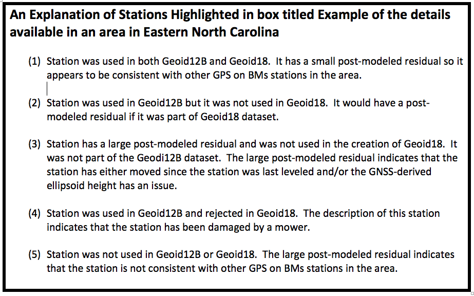 Figure 8. An Explanation of Stations Highlighted in box titled Example of the details available in an area in Eastern North Carolina (Screenshot: National Geodetic Survey)
