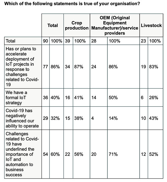 Respondents in the report, “Industrial IoT in the Time of COVID-19,” include crop producers, OEMs, service providers and livestock businesses, who report that COVID-19 demonstrated the importance of IoT to their businesses.