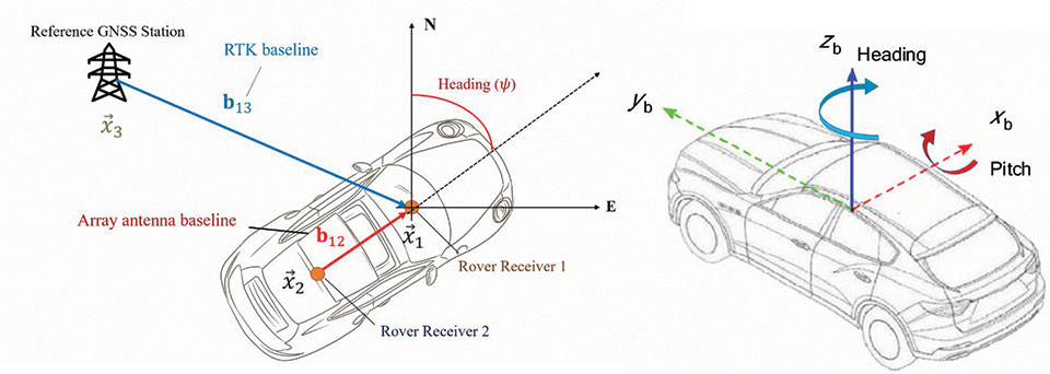 According to Figure 1, the two GNSS antennas on the vehicle’s rooftop span the array antenna baseline b12, which one can resolve for the Euler attitude angles to get the vehicle’s orientation (heading and pitch ).