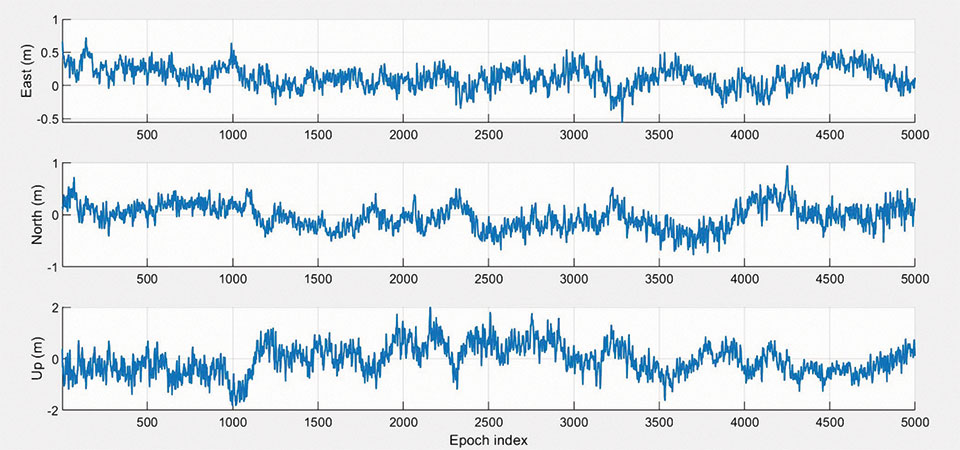 FIGURE 6 illustrates the 3D RTK positioning estimation error for our multi-receiver method. As one can notice, the algorithm succeeded in outputting a positioning result with an accuracy of about 0.5 meters for the horizontal coordinates, which is acceptable for a harsh environment.