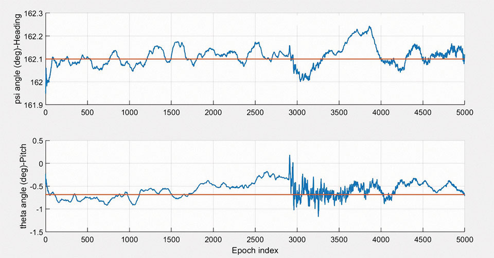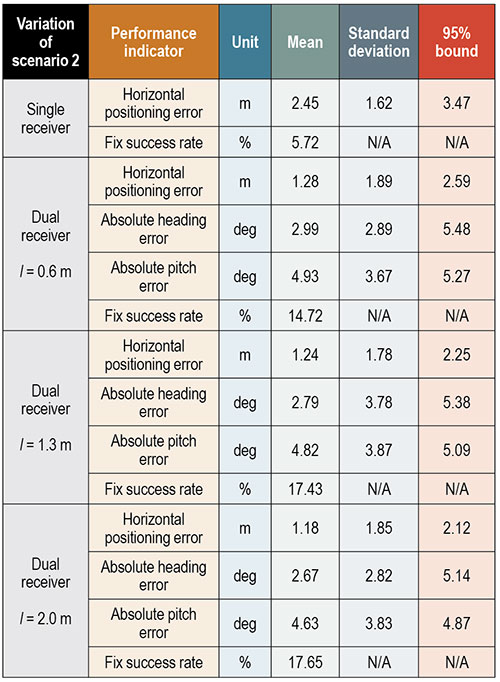 Typical Positioning and Attitude Determination Performance. We found that the dual-receiver system performs better than the single-receiver situation and provides better solution availability thanks to the doubled observations redundancy.