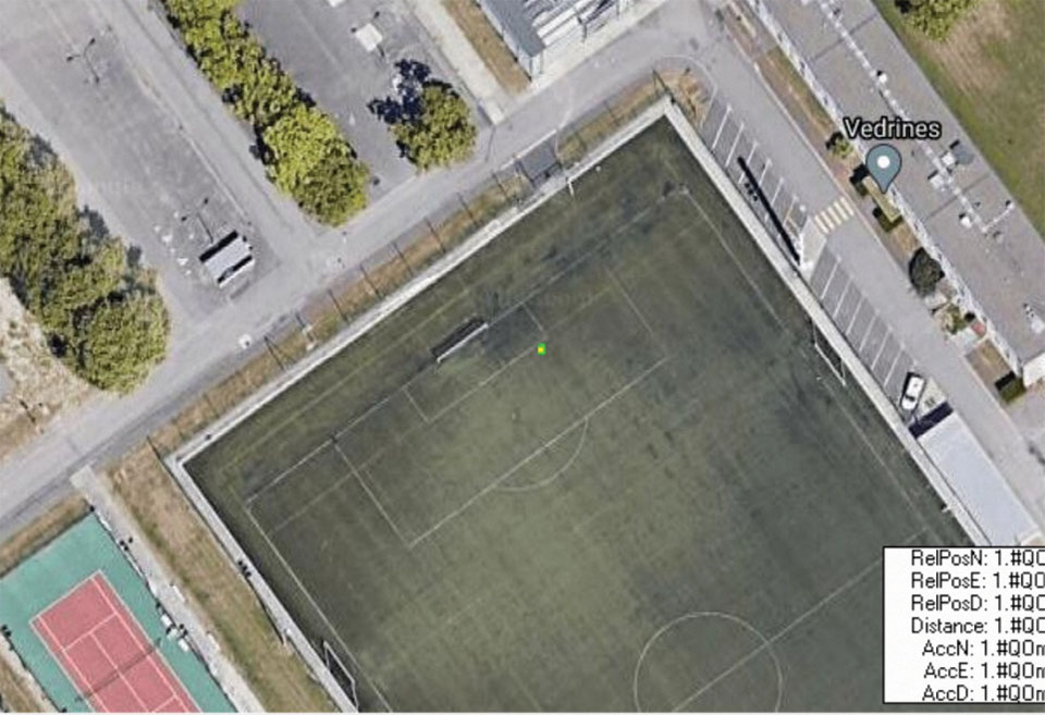 Open-Sky Environment. To get an open sky and stable environment, the first measurement session took place on the football field of the École Nationale de l’Aviation Civile (ENAC) in Toulouse. As shown in FIGURE 3, the two receivers are static and their positions are fixed on the football field with favorable satellite visibility. This scenario was mainly used for validation of the algorithm implementation and to provide a reference for our multi-receiver system performance.