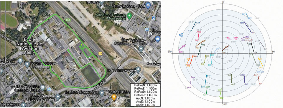 Suburban Environment. The second measurement session took place on the ENAC campus. The true trajectory provided by the high-end equipment and the corresponding satellite visibility during the data collection are shown in FIGURE 4.