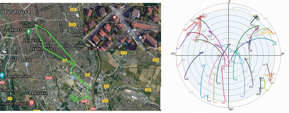 Urban Environment. The third measurement session was performed when the vehicle was driven from ENAC to Toulouse’s city center. The whole trajectory in Google Earth and the corresponding satellite visibility during the data collection are shown in FIGURE 5.