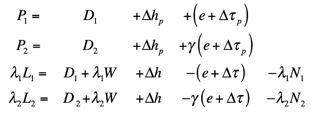 Equations (1) take into account all the biases related to delays and clock offsets. The four independent parameters, Δh, Δτ, Δhp, and Δτp, are equivalent to the definition of one clock per observable. However, our choice of parameters emphasizes the specific nature of the problem by identifying reference clocks for code and phase (Δhp and Δh) and the corresponding hardware offsets (Δτp and Δτ). These offsets are assumed to vary slowly with time, with limited amplitudes.