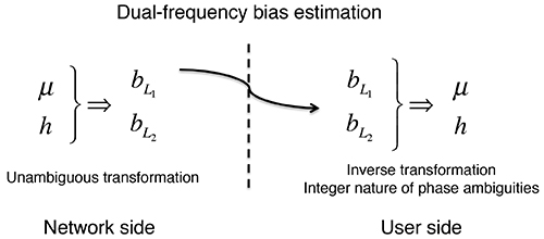 Bias Estimation in the Dual-Frequency Case. The new phase biases identification in the dual-frequency case is straightforward. There are two biases (bL1, bL2 ) to be estimated using two combinations (µ and h). The problem to be solved is described in FIGURE 1.