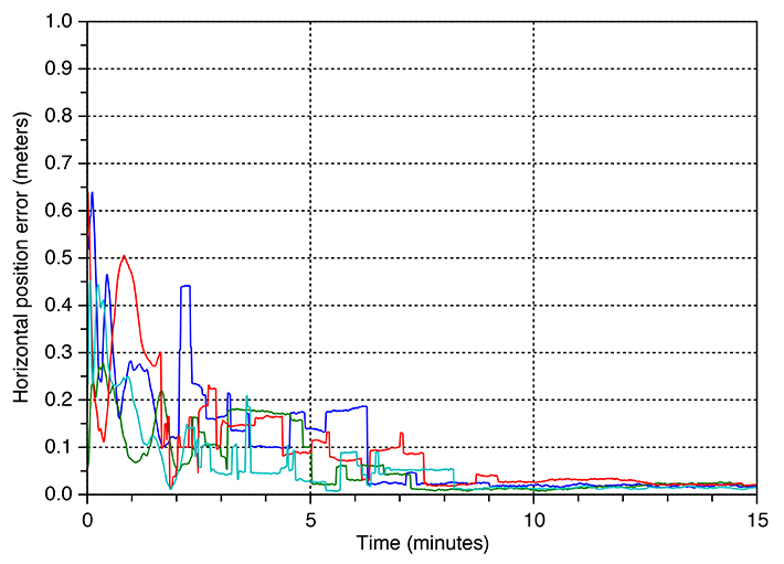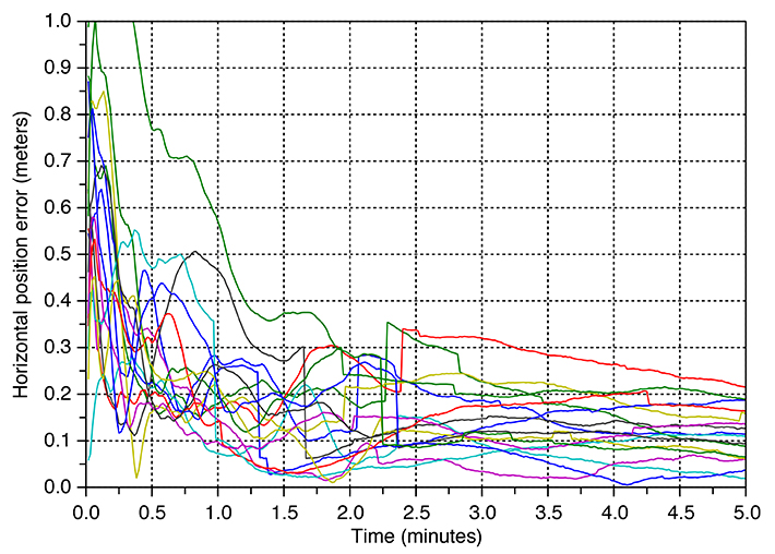 FIGURE 10 shows the convergence time of several PPP runs in this context (16 different runs of five minutes are superimposed), in terms of horizontal position error.