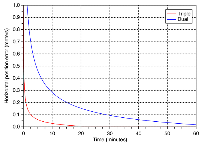 • Triple-frequency convergence (GPS only, 10 satellites in view, four Block IIF satellites).