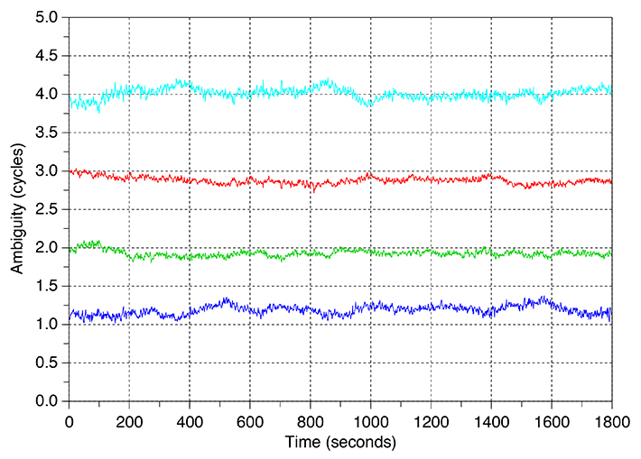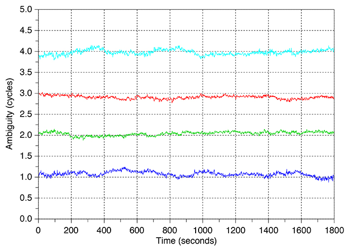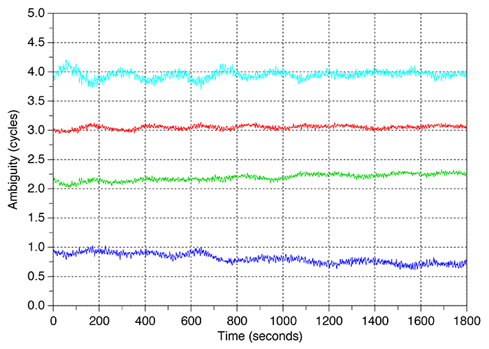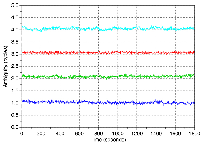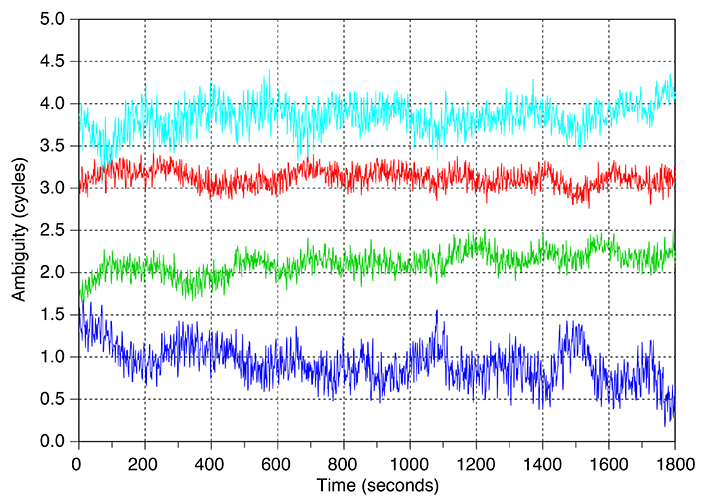 We present in the following graphs various ambiguity residuals for the four Block IIF satellites in view. The values of each ambiguity are offset by an integer value for clarity purposes.