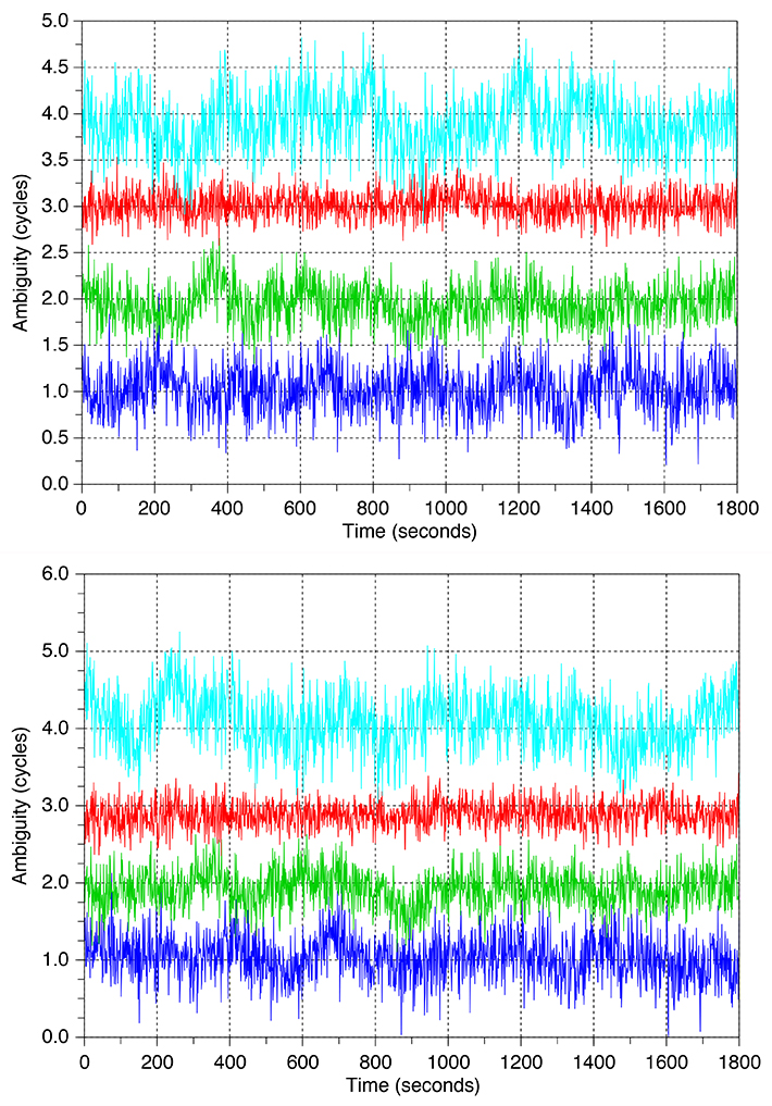 FIGURE 4. Ambiguity residuals for widelane combinations; top: 1-2 widelane, bottom: 1-5 widelane.