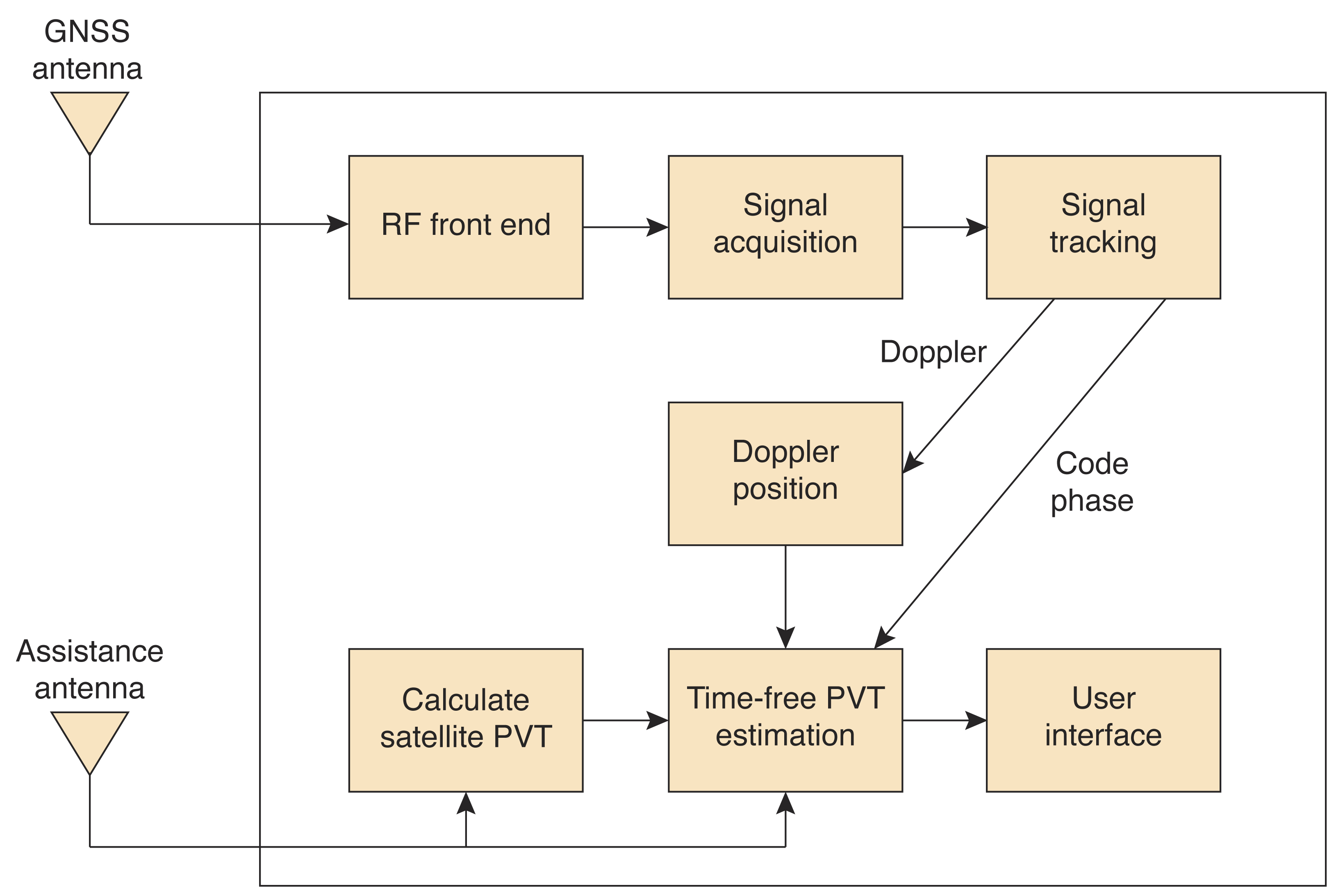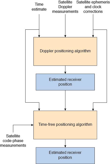 Subsequently, the time-free positioning algorithm then inputs the Doppler estimate as its initial a priori estimate of the receiver position. The existing assisted-GNSS satellite ephemeris and clock information as well as the coarse estimate of the GPS Time kept by the receiver are also available for the time-free estimation.