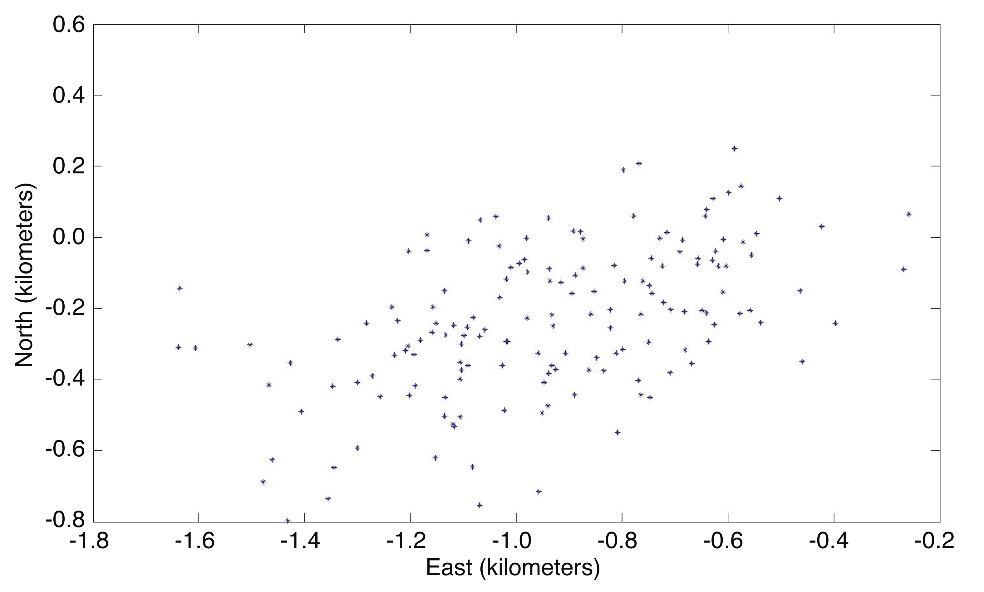 Off-Air Signal Demonstration. The Doppler positioning algorithm was first tested using live off-air signals. These signals were captured using a USB front-end sampler for about 1 minute. This raw sampled data was logged to a file and subsequently processed by our fastGPS software receiver. To act as a truth reference, the sampled data is first processed using the traditional pseudorange least-squares position-estimation technique. This position is then chosen as the true position and the file is once again processed in fastGPS but using the Doppler positioning algorithm described above. Note that the C/A-code pseudorange positioning technique is known to be accurate to the order of several meters. However, achieving high accuracy using the Doppler method is not of large concern as the goal of this initial estimation is to initialize the time-free algorithm and not act as a result in itself. So for the case of this demonstration, it is not useful to compare the Doppler positioning results to those of a pseudorange position estimation. We are principally interested in demonstrating that the errors in Doppler position estimation are within acceptable limits for initializing time-free positioning.
