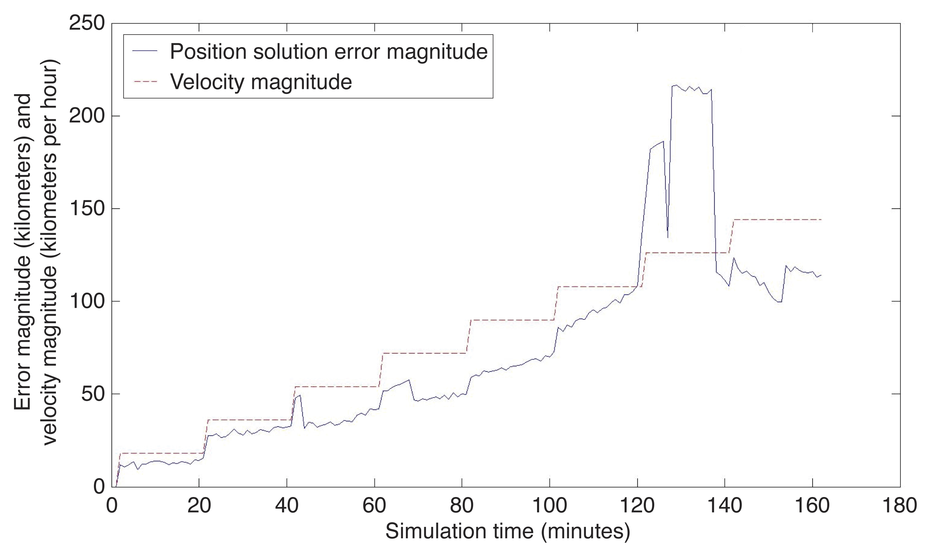 Dynamic Receiver Performance Evaluation. This algorithm was also tested using simulated data to assess its sensitivity to receiver dynamics. The velocity of the receiver directly influences the Doppler positioning solution estimation. This Doppler contribution will directly contribute to the estimation error and needs to be properly assessed. The impact of the receiver velocity on the accuracy of the solution was investigated using a simulated receiver under a range of dynamics conditions. As will be shown below, the accuracy of the Doppler position estimate will limit when it can be used to initialize the time-free position estimate. This is demonstrated by simulating the Doppler position estimation accuracy for a receiver gradually increasing in velocity.