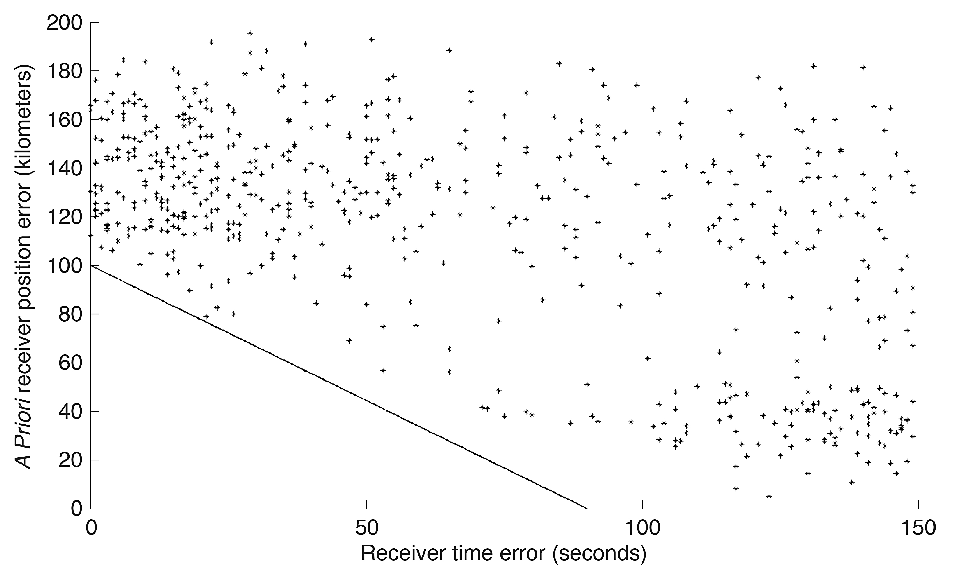 Subsequently, it was shown that time-free positioning requires an a priori position estimate that is accurate to within about 100 kilometers of the true position and a receiver time that is accurate to within a few seconds to assure algorithm convergence. If the a priori position estimate goes beyond 100 kilometers, there is a probability of divergence of the algorithm even with accurate receiver time. A coarse time accuracy threshold of 10 seconds is selected in this case as it is believed that GNSS receivers with assisted-GNSS capability will not have a lot of difficulty syncing their clocks to this accuracy.