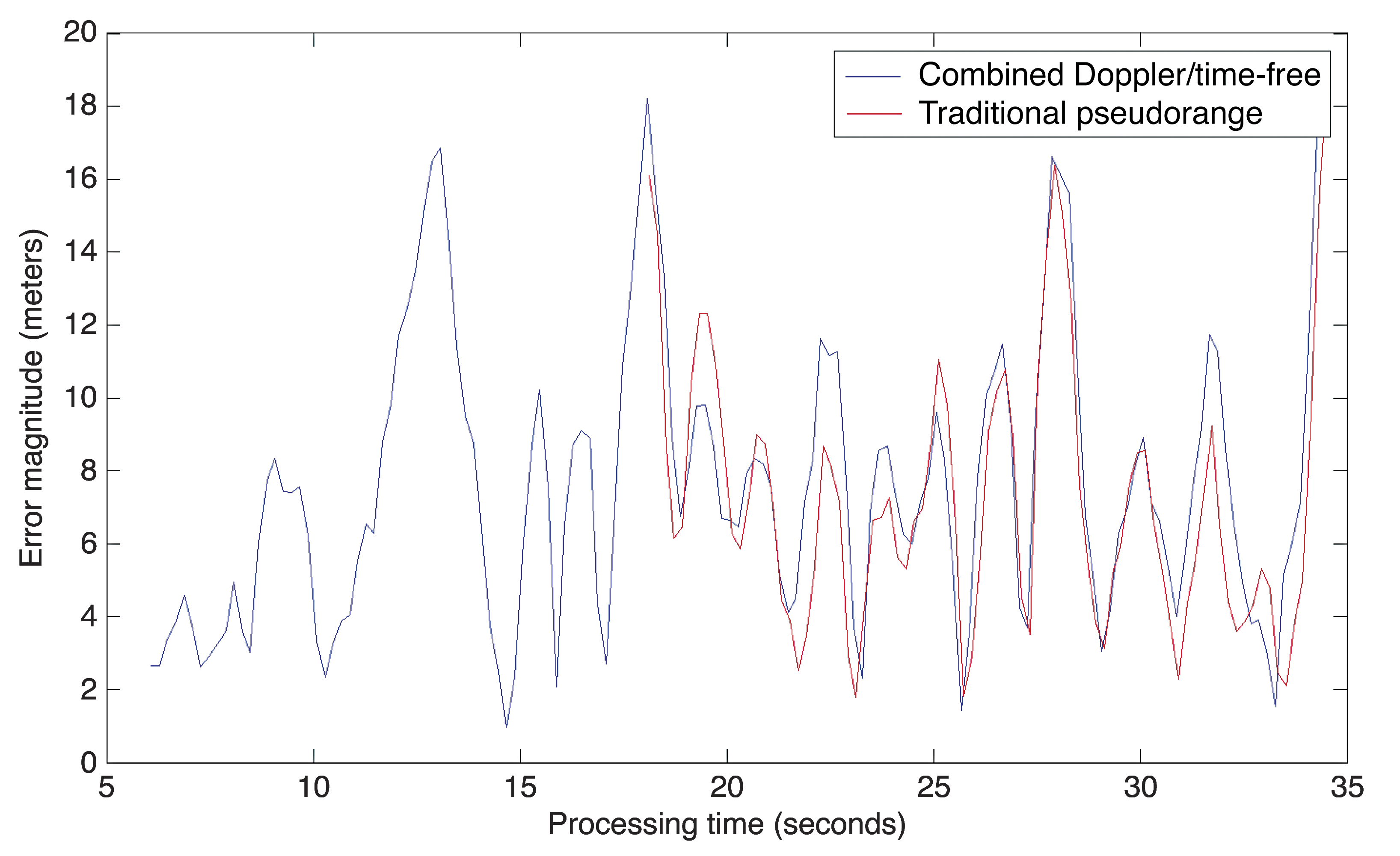 Comparison to Traditional Estimation. The combined algorithm was tested on multiple sets of off-air data from the U.S., Canada, and the U.K. The root-mean-square error of the horizontal position estimates and the mean geometric dilution of precision during the observations for each of the tested off-air data sets are shown in Table 1. The error magnitudes of the resulting position solutions are on the same order for both the standard pseudorange least-squares and time-free position estimates. This is to be expected, for if the time-free algorithm computes the correct integer milliseconds, the algorithm will converge to nearly the same solution as the traditionally determined pseudoranges since the code-phase measurements are identical. In this comparison, both the pseudorange and combined Doppler/time-free algorithms were started assuming an initial receiver position at the center of the Earth. As a final check that this method provides comparable results to those from the traditional pseudorange case, we directly compared the error magnitudes of the two methods over a stretch of the same data. This will also prove to illustrate how time-free positioning is capable of more quickly estimating the position than other methods since it does not need to decode the satellite signal’s navigation message.