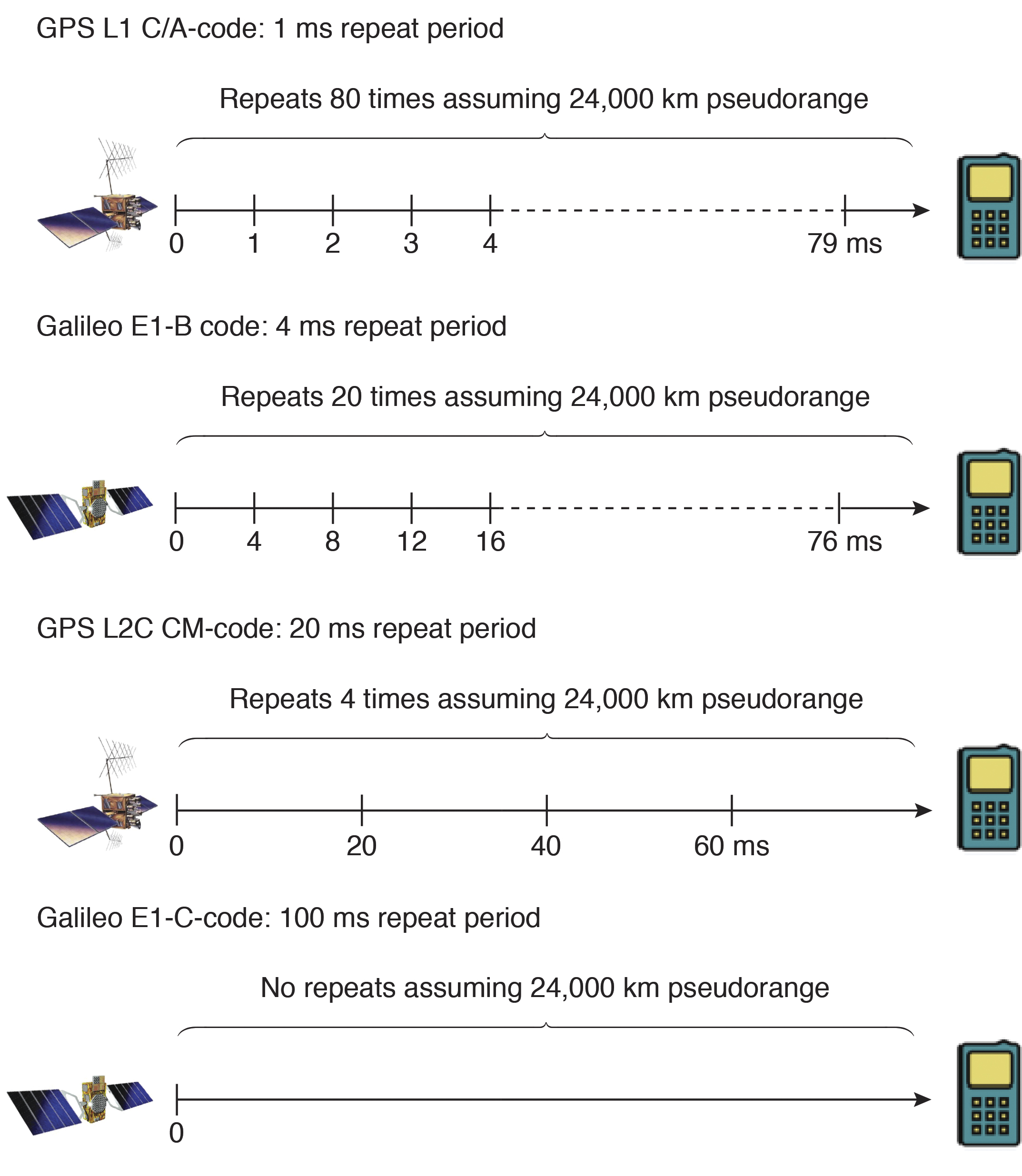The code-phase measurements from at least five GNSS satellites form the last piece of the puzzle. They are obtained as a direct output of the receiver delay lock loop. In the case of GPS C/A-code signals, these will be up to 1 millisecond in length, with longer durations possible with other GNSS signals as discussed below.