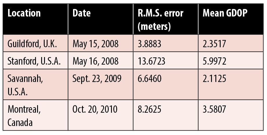 - TABLE 1. Root-mean-square (R.M.S.) error and geometrical dilution of precision (GDOP) for off-air GPS data sets used with the fastGPS software receiver.