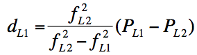 where d is the ionosphere delay, P denotes pseudorange, and f denotes frequency. The subscript notation L1 and L2 refers to the GPS L1 and L2 frequencies, respectively.