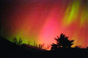 Such large storms are also often accompanied by displays of aurora (aurora borealis and aurora australis) at lower latitudes than normal. Figure 4 shows full-sky aurora observed near Fredericton, New Brunswick, Canada (46 degrees north latitude) on October 31, 2003