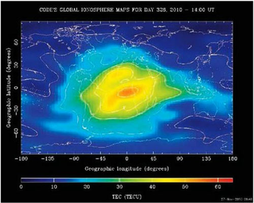 The geographic variation of TEC is illustrated with a global ionosphere map from the Center for Orbit Determination in Europe (CODE) shown in Figure 1. Global ionosphere maps are generated at CODE on a daily basis, and the maps are available on the CODE website (see Further Reading).