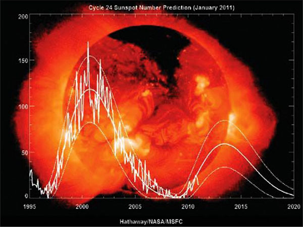 The current prediction for cycle 24 gives a smoothed sunspot number maximum of about 59 in June/July of 2013. This peak is much lower than that of the previous cycle. We are currently two years into cycle 24 and the predicted size continues to fall. According to forecasters, predicting the behavior of a sunspot cycle is fairly reliable once the cycle is well under way (about three years after the minimum in sunspot number occurs). Prior to that time, the predictions are less reliable but nonetheless equally as important.