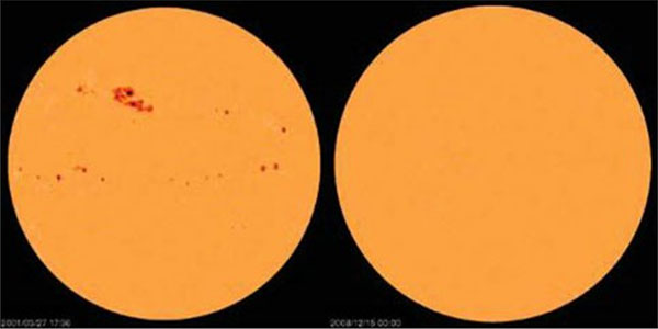 The number of sunspots generally follows a cycle of about 11 years. During the last few years (2007–2009), we have experienced a time period with a low number of sunspots. In fact, there were many days in a row without any sunspots visible (see Figure 3). During the next three to four years, the number of sunspots is expected to increase, and this will be followed by a decrease until we reach a new period of low solar activity in 2019–2020.