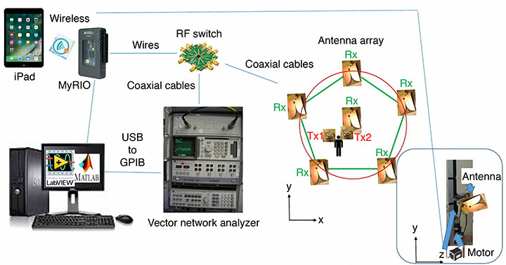The system can be manually controlled by an Apple iPad or automatically controlled by a personal computer (PC). The PC runs the National Instruments (NI) Laboratory Virtual Instrument Engineering Workbench (LabVIEW) programming environment and an NI instrument monitor for debugging the operating process. Further information processing is carried out by combining the received signal from a vector network analyzer (VNA) though the USB-based NI-DAQmx driver software and associated cable and a mobile device such as the Apple iPad for remote control and cloud access. Two ports of the VNA are connected to an RF switch to transmit and receive signals using the antennas located in the scanning area. During the detection phase, the anchor antennas are sequentially active, and a number of signal time series are transferred back to the PC for imaging processing. The delay-and-sum algorithm is used for signal processing and imaging reconstruction in Matlab to find the position of any obstruction in the scanning area.