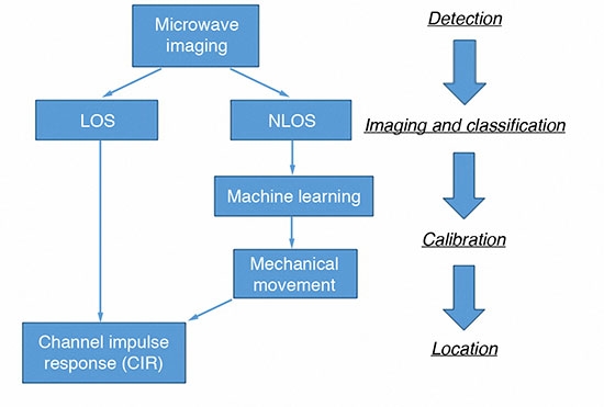 There are four main phases of the operation. Firstly, the radar-based UWB microwave imaging system is introduced into the localization system to classify the LOS and NLOS environments. If the environment is LOS, the system will go to the location phase directly. If the environment is NLOS, further operations for the antenna array configuration need to be carried out to reduce the multipath effect from the non-target object. In this case, the only located target is the pair of wearable tag antennas.
