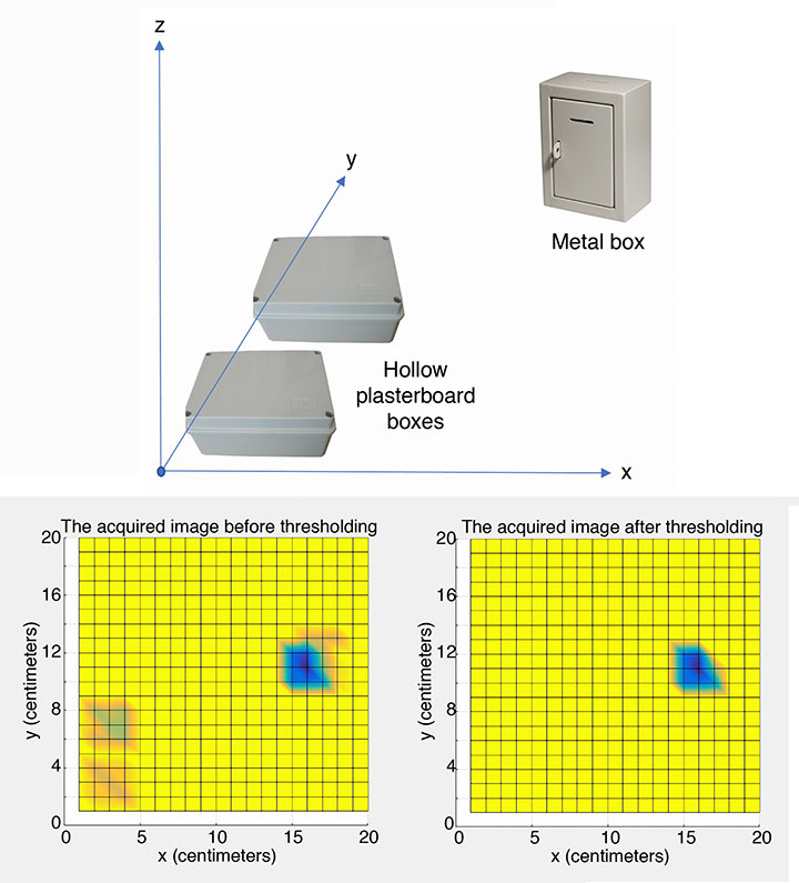 Various material obstructions such as hollow plasterboard boxes, solid concrete items and metal boxes were investigated during our experiments. We had to define threshold values for the various materials to get a more visually acceptable image.
