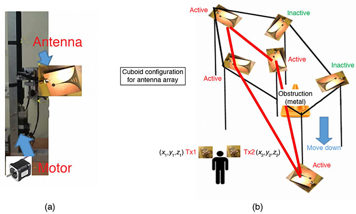 In this particular experiment, the obstruction (the metal box) is detected on the right upper side of the scanning area, so the cuboid configuration was selected as the anchor station setup. Four antennas on the left of the area were selected as receiving antennas as shown in FIGURE 5. Figure 5(a) highlights one of the antennas.