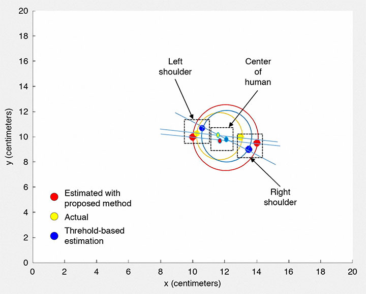 In TABLE 1, we summarize the localization errors obtained in the different environments using the two estimation techniques. The average accuracy achieved for our proposed approach for a single antenna is in the range of 3 to 5 centimeters. Given that there are two sensing antennas, one on each shoulder, we could establish a middle point as the position of the human body, and combining the results of each antenna, we could improve the accuracy to about 2.5 centimeters in the NLOS environment.
