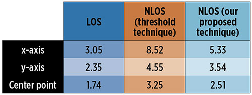 FIGURE 6 shows the localization results for the situation in Figure 4. The same experimental method was repeated but using a threshold-based TOA estimation procedure, and the results compared with our procedure. The results using that approach are also displayed in Figure 6.