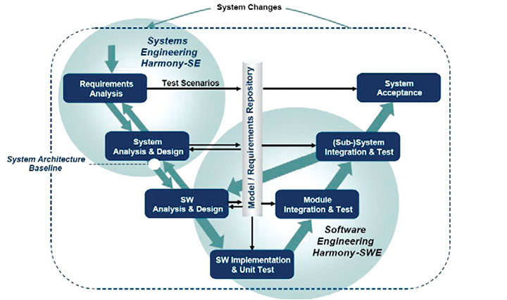 Model-based systems engineering (MBSE) is predicated on the notion that a system is developed by use of a set of system models that evolve throughout the development lifecycle, from abstract models at the early stages down to the operational system. A visual presentation is provided by FIGURE 1, which shows the roles of MBSE approaches within the systems engineering V-shaped process. Specifically, the MBSE approaches enable the designer to effectively trace the requirements and design alternatives on the descending branch of the “V.” For the same characteristics, MBSE facilitates the verification through a model repository that interconnects not only the design products, but also the stakeholders involved in the entire process. In addition, MBSE approaches support the automatic generation of the documentation and of other artifacts, particularly software. All of these capabilities eventually enable the validation of the implementation activities on the ascending branch of the V-process. Also, in this case, MBSE and the model repository play a major role in connecting design to implementation, and users and designers to developers.
