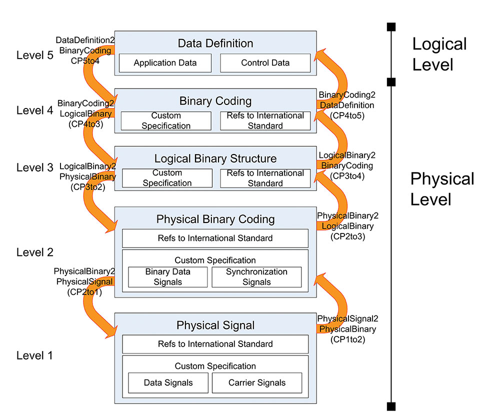 The conversion processes describe the activities to be performed for deriving message values between adjacent levels of the above structural specification. As shown in Figure 3, eight processes should be defined to specify all the conversions between adjacent levels. For example, the DataDefinition2BinaryCoding process defines the activities to be performed for the derivation of the logical binary sequences representing data values. Similarly, the LogicalBinary2PhysicalBinary process defines the activities for the implementation of convolution or encryption algorithms on the logical binary sequence. However, these processes do not always need to be explicitly defined. In particular, if the implementation of a process is trivial or standard, a textual note referring to an external document may suffice for the specification purposes.