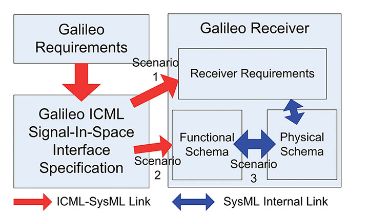This capability may be useful in several scenarios. In particular, we have identified three scenarios. Scenario 1 consists of the identification of the receiver requirements that are introduced or modified by the Galileo OS SIS, with respect to existing GPS receivers. Scenario 2 concerns the linking between the ICML specification and the receiver functional schema to identify how a Galileo receiver will differ from existing GPS solutions. Scenario 3 is a development of Scenario 1 and Scenario 2, in which the physical schema definition and the physical components identification (HW and SW) may further exploit the ICML-based approach for supporting the reuse of existing GPS components.