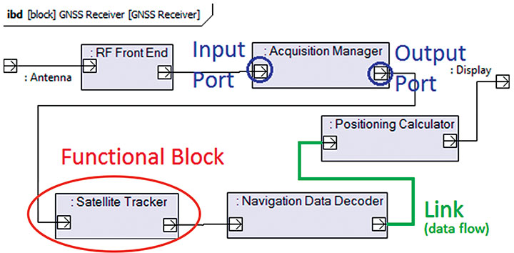 A GNSS receiver functional schema has been derived from A Software-Defined GPS and Galileo Receiver: A Single-Frequency Approach (see Further Reading) and its equivalent SysML internal block diagram (IBD) is shown in FIGURE 6.