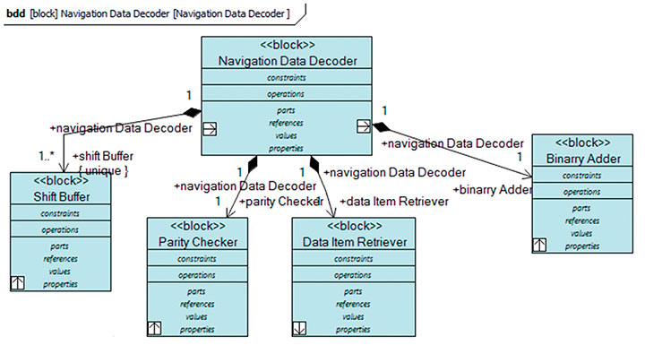 In this short article, we have particularly focused on the navigation data decoder. The data decoder is defined by a Block Definition Diagram (BDD) and an IBD, which are shown in FIGURES 7 and 8, respectively.