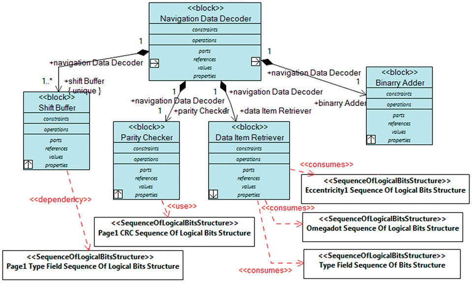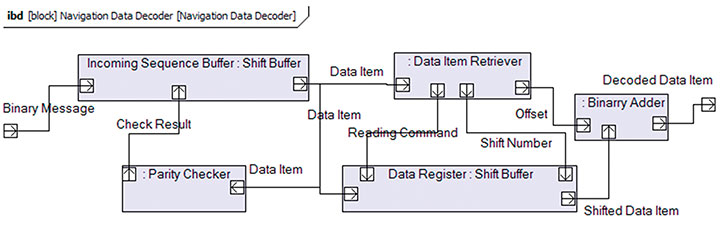 In particular, the BDD indicates that the navigation data decoder is composed of four types of blocks: shift buffer, parity checker, binary adder, and data item retriever. The shift buffer receives the incoming physical sequence of bits, which is subsequently verified by the parity checker. The verified sequence is then processed to retrieve the standard binary format from the SIS-specific logical coding for the data item. This function is guided by the data item retriever, which stores the defined properties of each incoming data item, in the form of a physical sequence of bits (level 1). As a consequence, the navigation data decoder is involved with data defined at several of the above-defined ICML levels. From this description, it is also possible to sketch the preliminary IBD diagram of Figure 8.