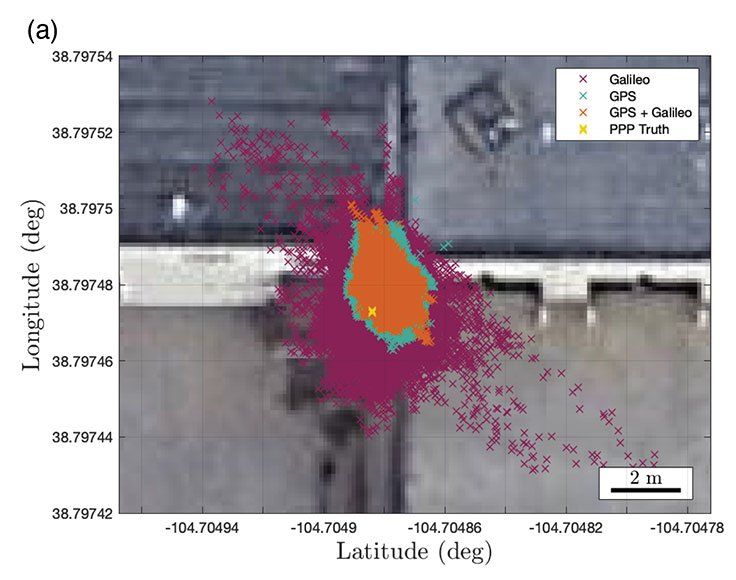 FIGURE 1b. Map visualization of the comparison among position solutions computed using only GPS, only Galileo and a combined GPS plus Galileo dual-constellation solution at CU Boulder. (Image: Authors)