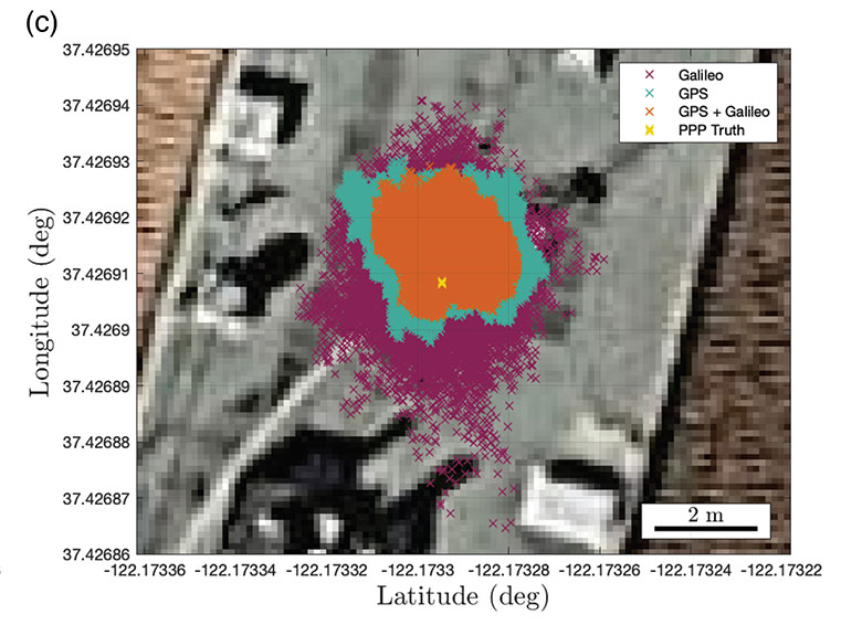 FIGURE 1c. Map visualization of the comparison among position solutions computed using only GPS, only Galileo and a combined GPS plus Galileo dual-constellation solution at Stanford. (Image: Authors)