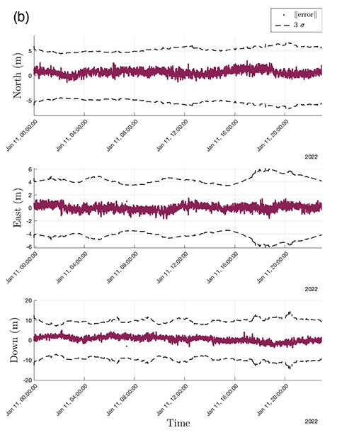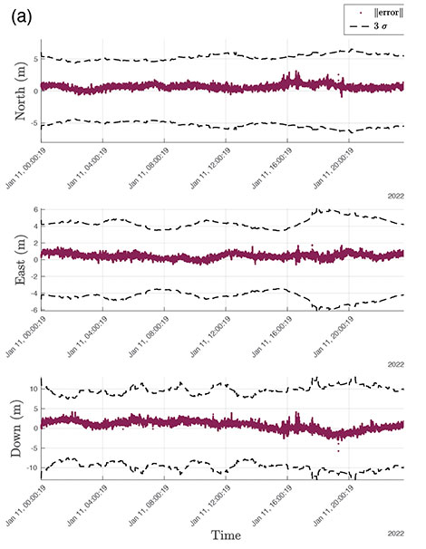 Photo:FIGURE 2a. Dual-constellation north-east-down error vs. known truth, bounded by a 3σ threshold, at Colorado Springs. (Image: Authors)