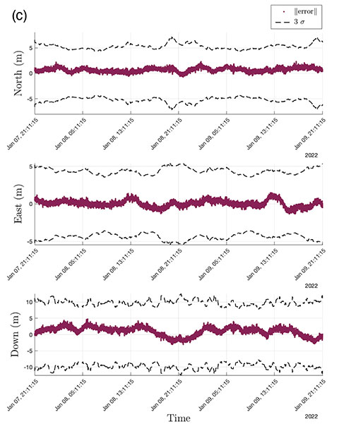 FIGURE 2c. Dual-constellation north-east-down error vs. known truth, bounded by a 3σ threshold, at Stanford. (Image: Authors)