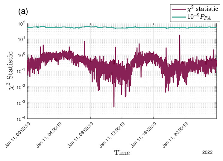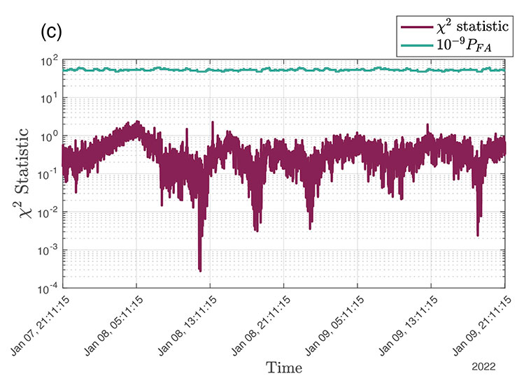 FIGURE 4a. GPS χ2 and probability of false alert (PFA) threshold for the nominal noise environments at Colorado Springs. (Image: Authors)